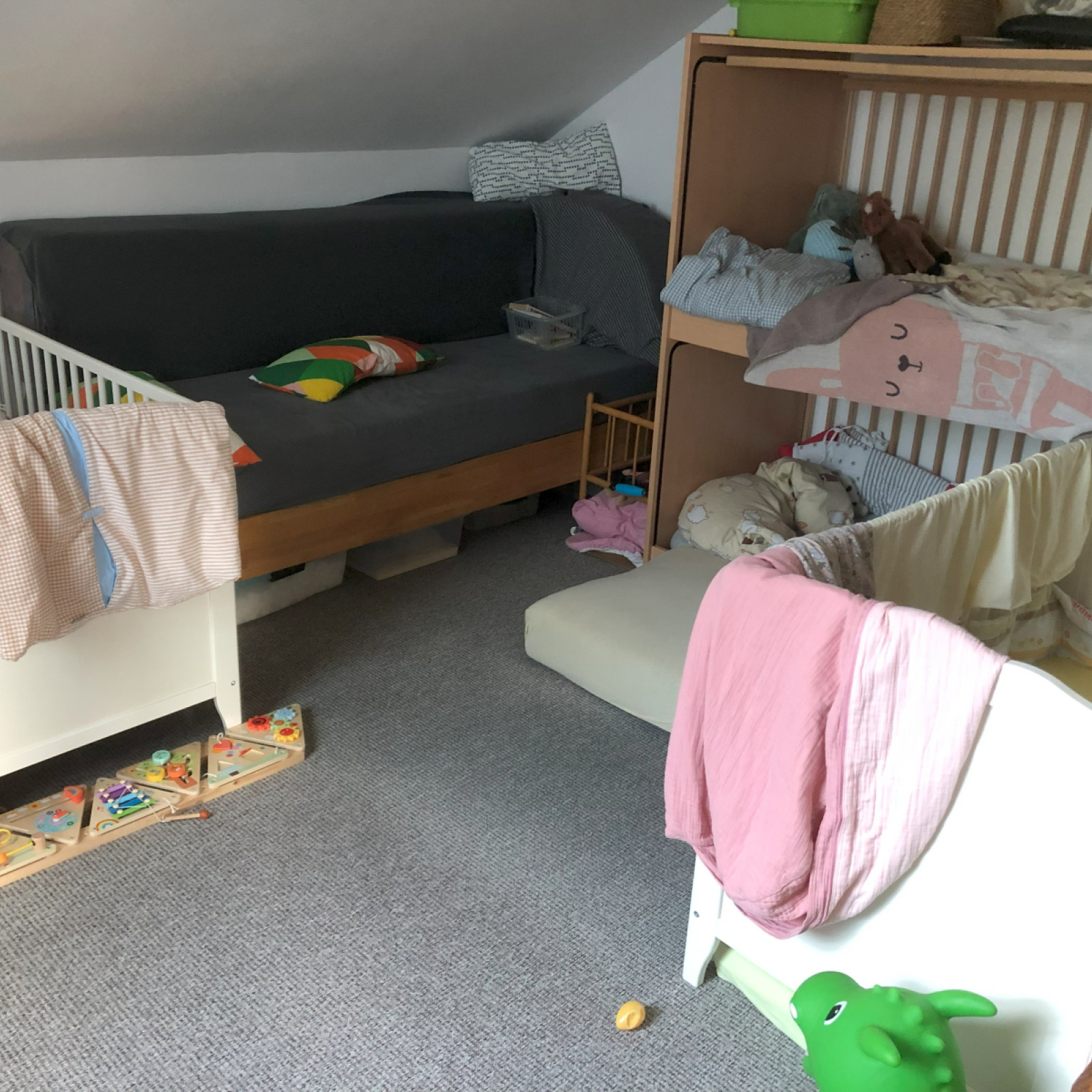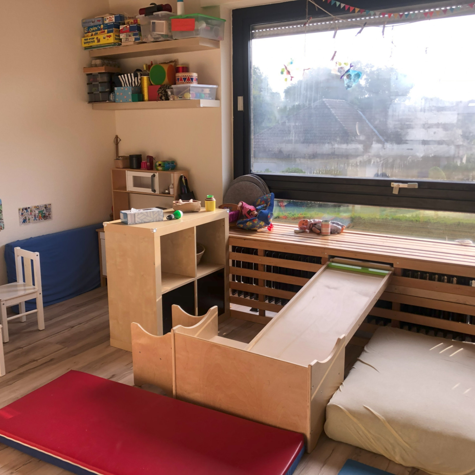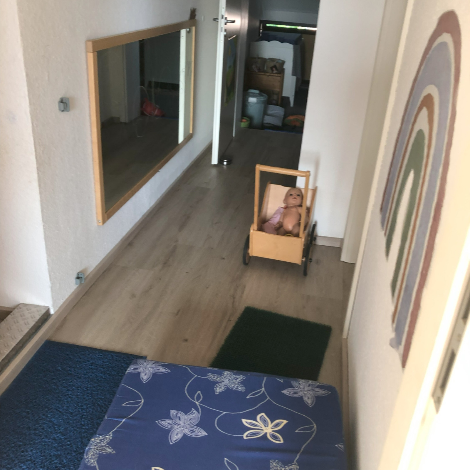 Die Räumlichkeiten der "SpielWelt" befinden sich in der ersten Etage unseres Hauses auf ca. 85m2. Dort können wir zwei Flure, einen großzügigen Spielraum und den Ruhe- und Schlafraum zum Spielen und Toben nutzen.